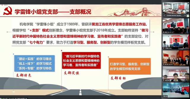 为深入学习贯彻全国两会精神,提高党员的政治素质和理论修养,增强党支部的创造力、凝聚力和战斗力,2022年3月16日下午,卓越联盟高校8个全国“百个研究生样板党支部”联合开展了“学习两会精神 勇担时代使命”云端共建活动。机电学院党委副书记吕焱老师,机电学院学生党建负责人黄郅博老师,学雷锋小组党支部全体党员学生参加了本次共建活动。