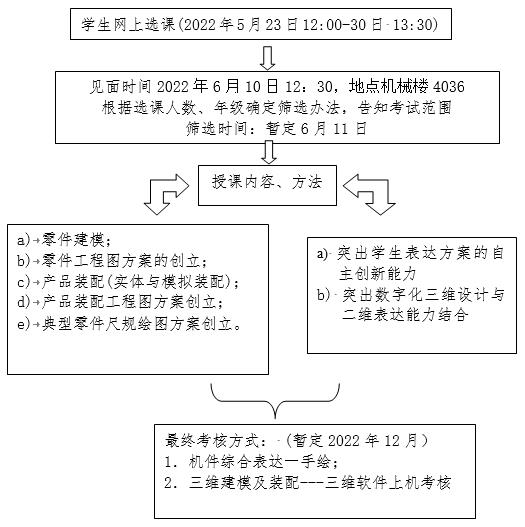 为此,我校在2013年至今每年均开设“先进成图技术与产品信息建模”机械类创新实验课。2022年秋季学期继续开课,本次开课实行学生网上选课,选课时间:2022年5月23日12:00—30日13:30。见面时间为2022年6月10日12:30,地点机械楼4036,通知选拔考核具体时间、地点及其它相关事项。