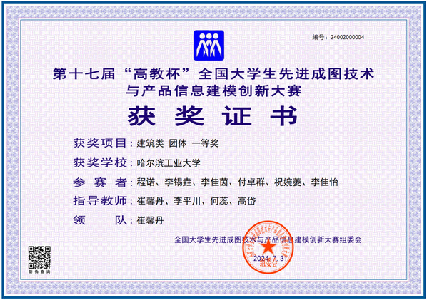 获得建筑类团体一等奖的代表队由建筑学院程诺、李锡垚、李佳茵、付卓群,土木学院祝婉菱,建筑学院李佳怡组成,机电学院崔馨丹老师、李平川副教授、何蕊副教授、高岱老师担任指导教师。建筑学院李佳怡、李锡垚获得附加赛建筑类BIM创新应用赛道一等奖。
